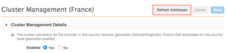 Administrators can update all of the addresses for a country with cluster codes using a data maintenance job. At the top of the Cluster Management page for a country, click Refresh Addresses.