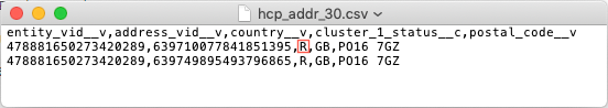To reverse the codes that you updated in the Overriding cluster codes section, change the cluster_1_status__c field from O (overriden) to R (reverse). Because this is an address file for the United Kingdom and IQVIA is the provider, the country__v field and postal_code__v values are required.