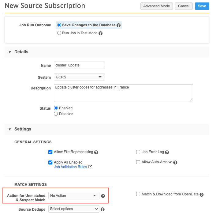 3. In the Job Run Outcome section, choose Save Changes to the Database so the addresses are updated during the job.