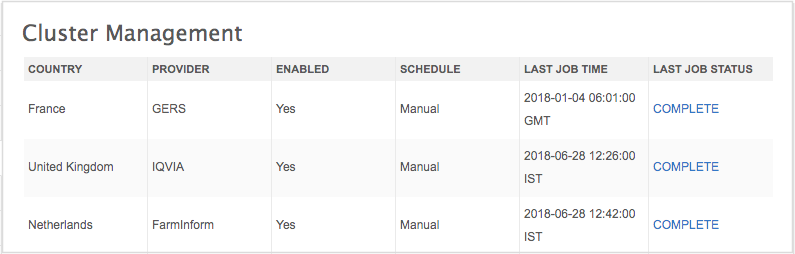 2. On the Cluster Management page, select the country/provider combination to configure. Only the countries that have been enabled for cluster management in your instance will display.