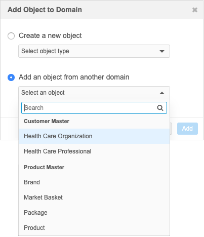 Add an object from another domain - Select an existing object from another domain to add it to the current domain. If there is only one domain in your Network instance, this option is not available.