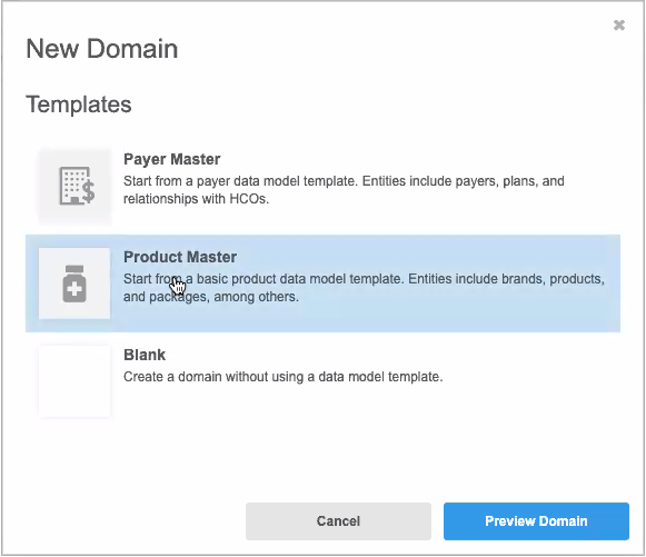 In the New Domain dialog, select an available template: Product Master or Payer Master. If the template is already used, it is dimmed and cannot be selected.