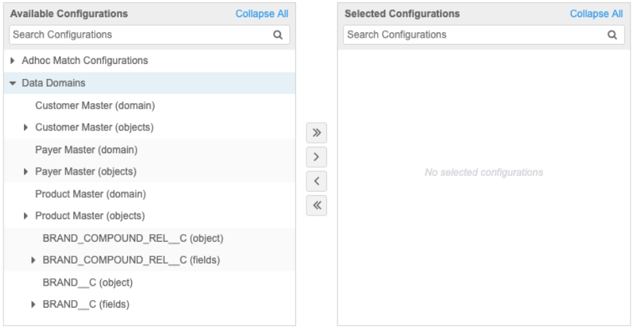 Domain objects - All of the objects in a data domain; for example, Product Master (objects). Moving this item into the Selected Configurations pane moves the domain and all of the dependent objects.