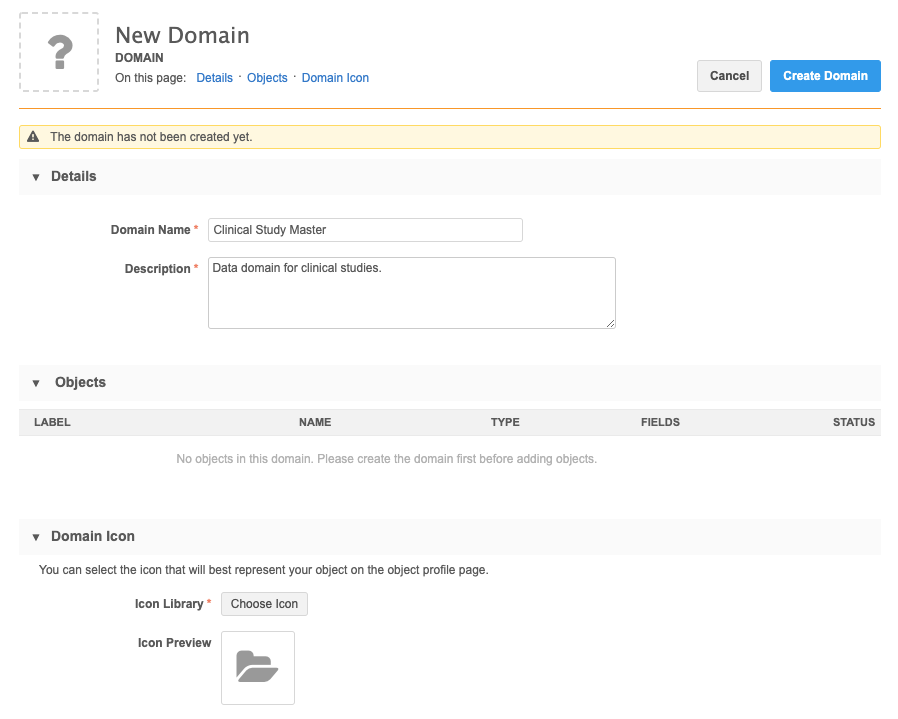- Define a Domain Name and Description. For example, you might create a domain for clinical study objects.
