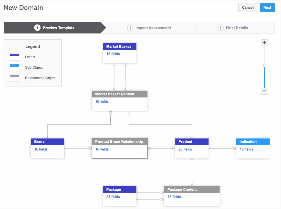 The Preview Template tab displays the ERD of the data model. Click any of the field links to preview the fields that will be added for each object.