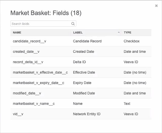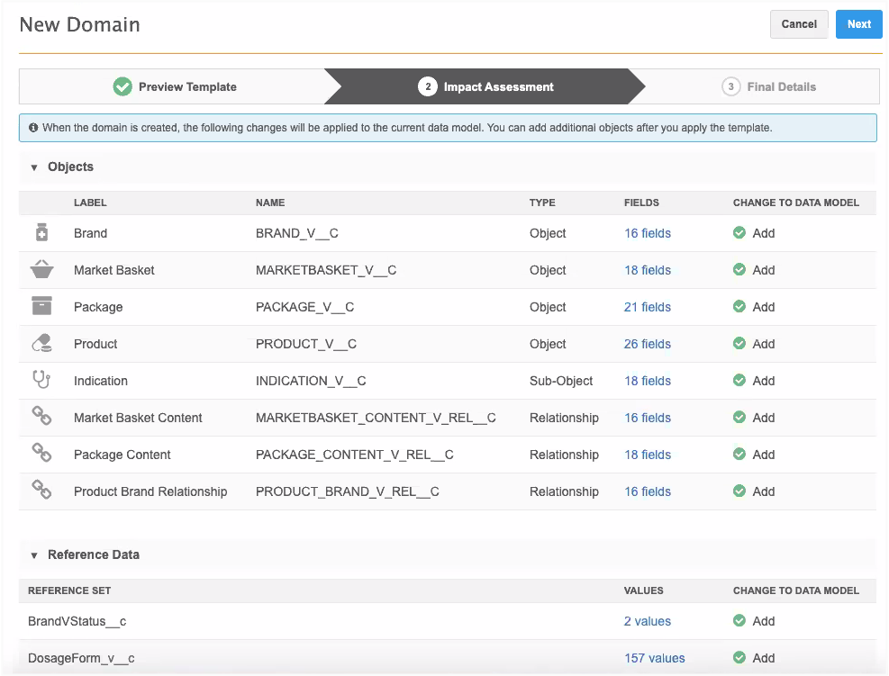 _V__Csuffix to ensure that there are no name conflicts with existing objects. Avoid creating any custom object names under the namespace that is reserved for Veeva custom domain templates. If you previously created an object with the same name as an object in the template, a warning message displays in the Change to Data Model column. The template cannot be applied when there is a name conflict. Contact Veeva Support to resolve the issue.-
