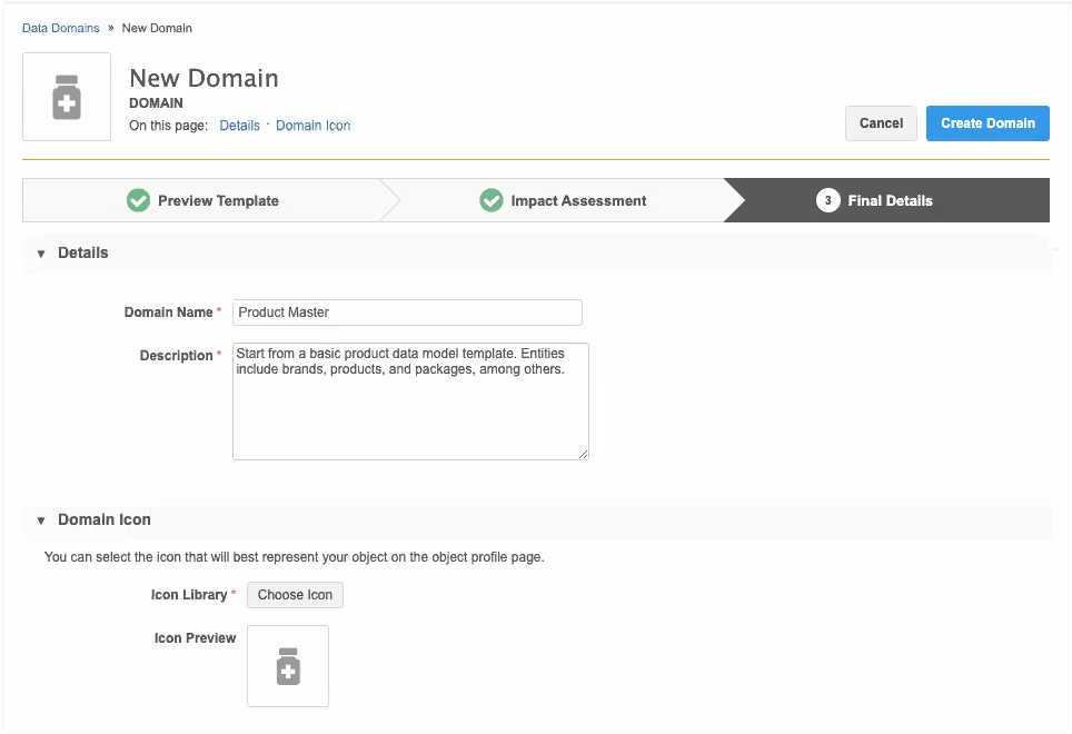 On the Final Details tab, you can customize the data domain by overriding the domain name and description. You can also choose a different icon.