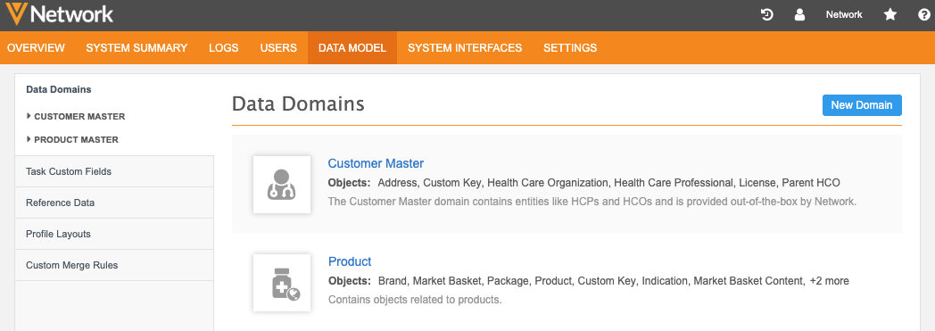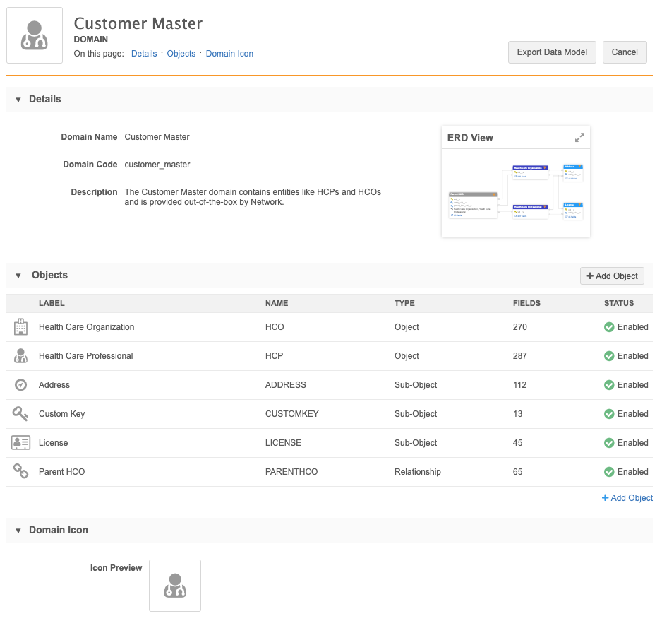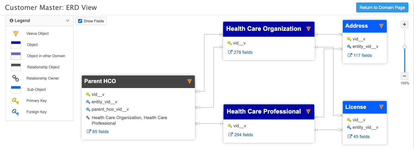 The Customer Master domain is created by default for your Veeva standard objects (HCPs, HCOs, addresses, licenses, parent affiliations).