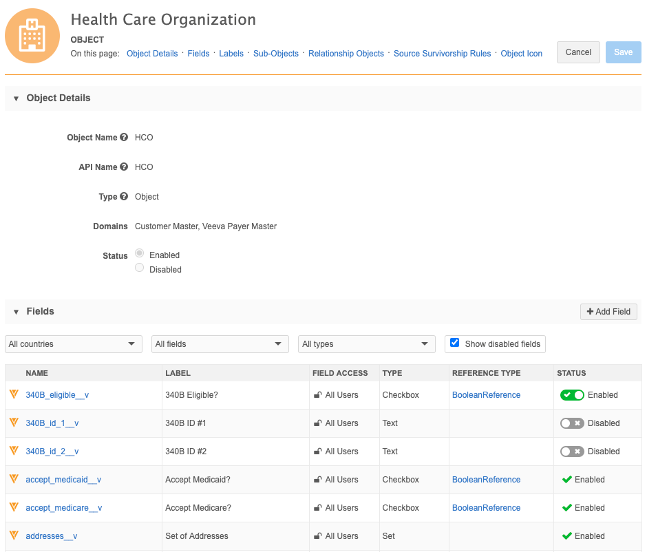 - Status - Enabled or Disabled. Veeva standard objects cannot be disabled.