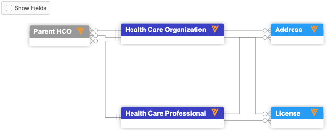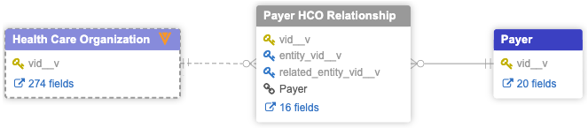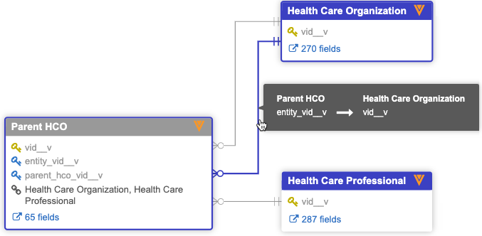 In this example, there are two lines connecting the Parent HCO and HCO objects because the HCO object is both an owning and related object in the relationship. The Parent HCO's foreign key,