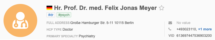 | Germany (DE) | prefix + medical_degree_1 + first_name + middle_name + last_name | |