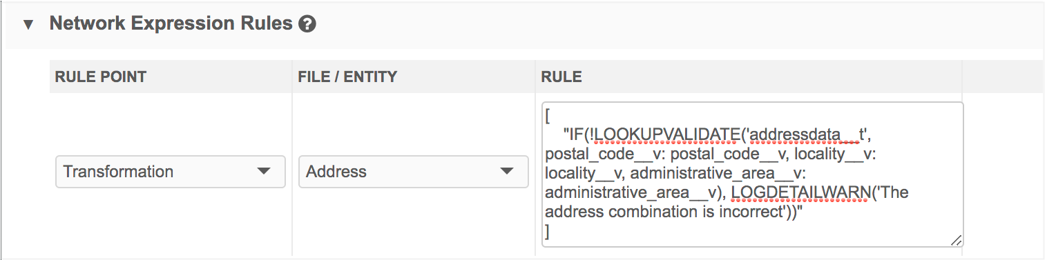 "IF(!LOOKUPVALIDATE('addressdata__t', postal_code__v: postal_code__v, locality__v: locality__v, administrative_area__v: administrative_area__v), LOGDETAILWARN('The address combination is incorrect'))"