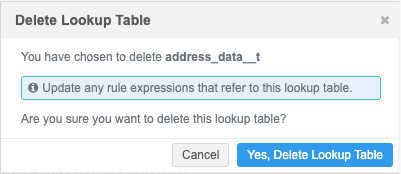 If they are no longer used, or created in error, lookup tables can be removed. On the Lookup Tables page, click the Delete icon in the table row.