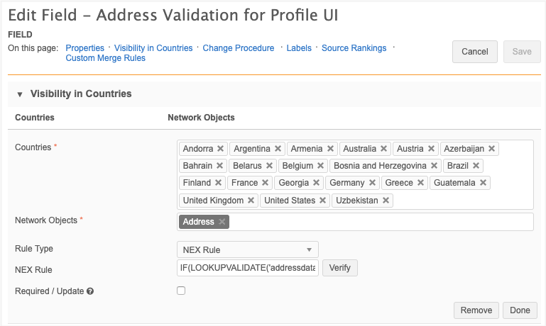 Select the field in the object configuration (Data Model > Data Domains) and click the Visibility in Countries section to add a NEX rule.