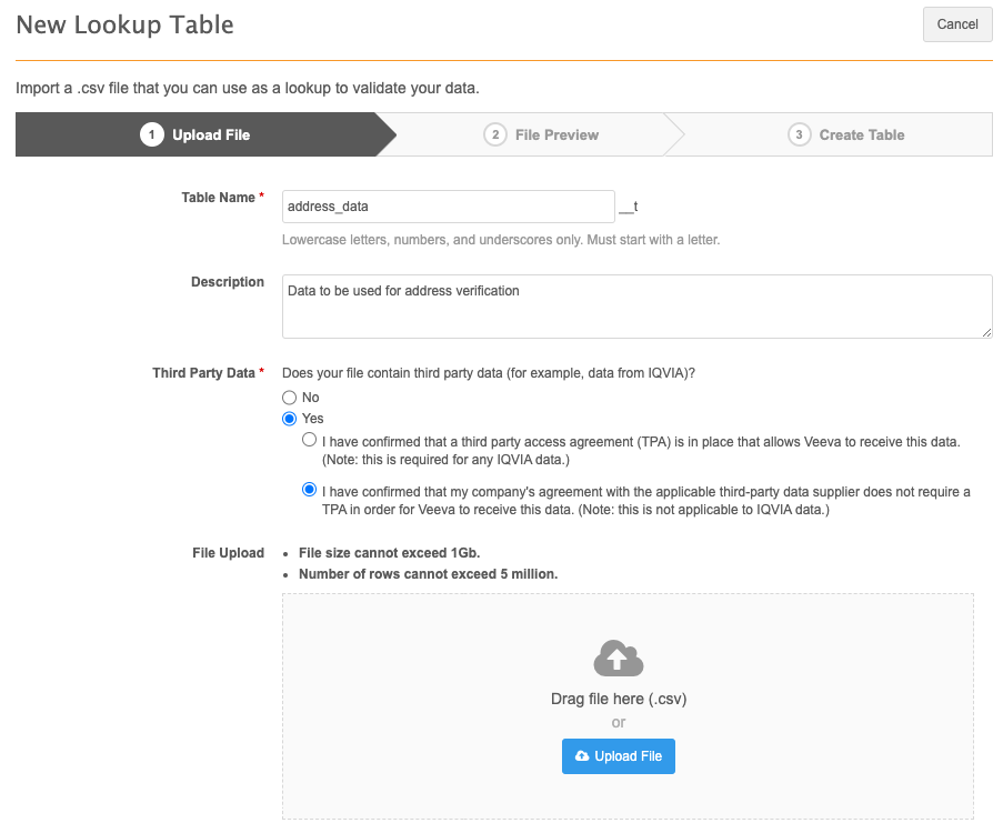 - Third Party Data - Indicate if the file that you are uploading contains third-party data. If you choose Yes, confirm that you either have a TPA in place, or that your agreement with the third-party data provider does not require a TPA for Veeva to receive the data.