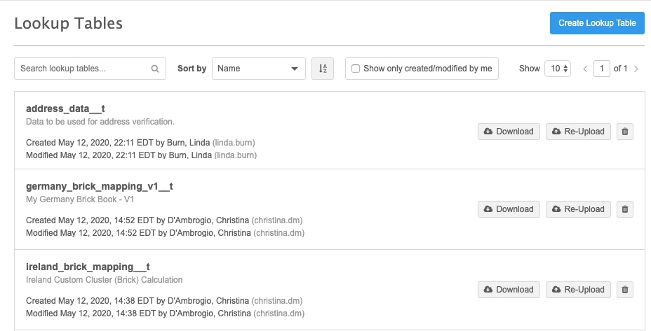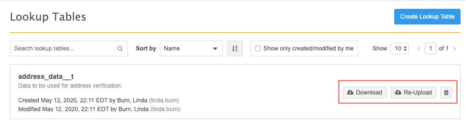 On the Lookup Tables page, you can search for a specific table name or sort the list to find your lookup table.