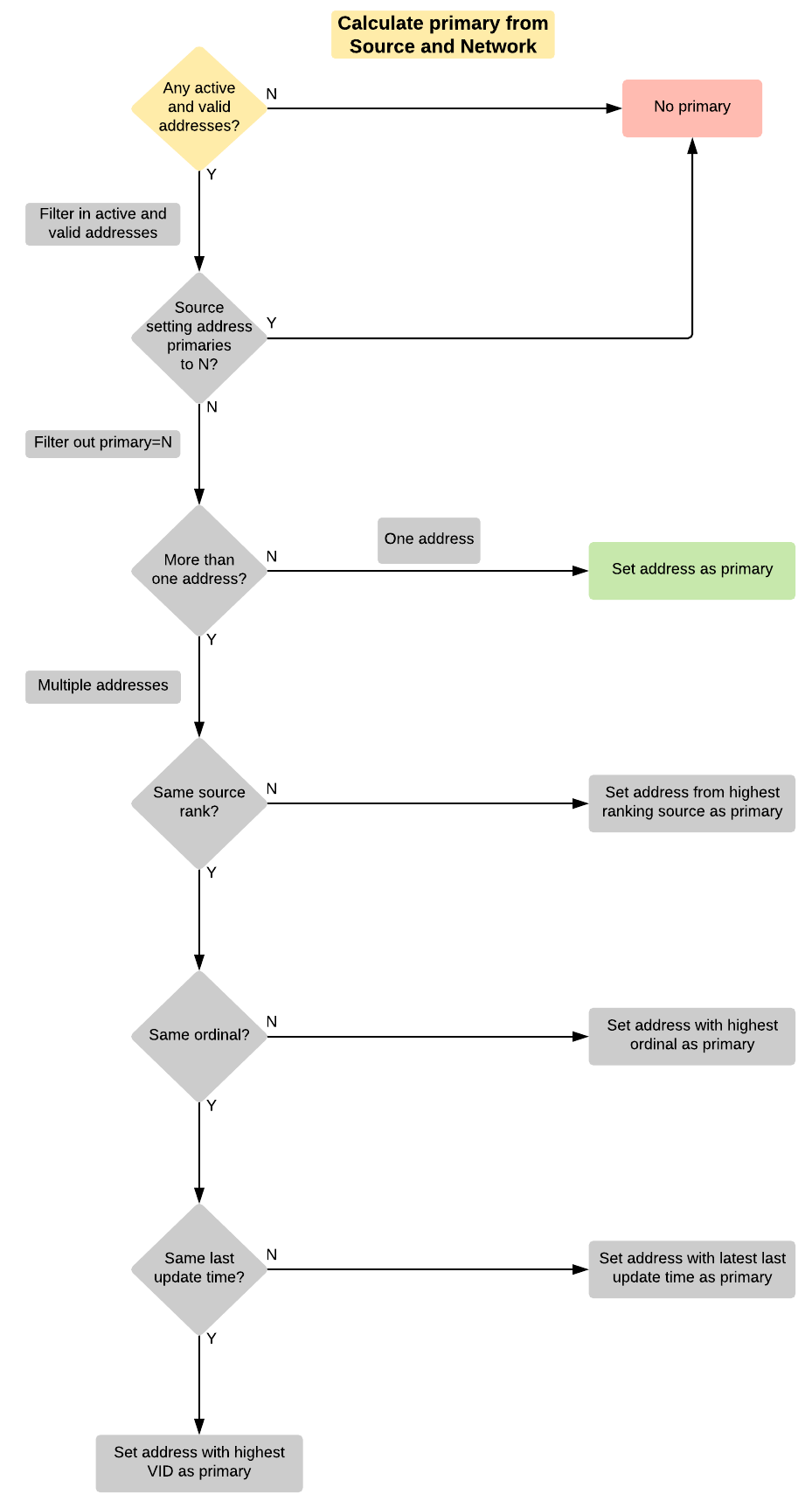 - Source rank - The rank on the primary field is the same or higher than the existing primary address (rank of 1 is highest).