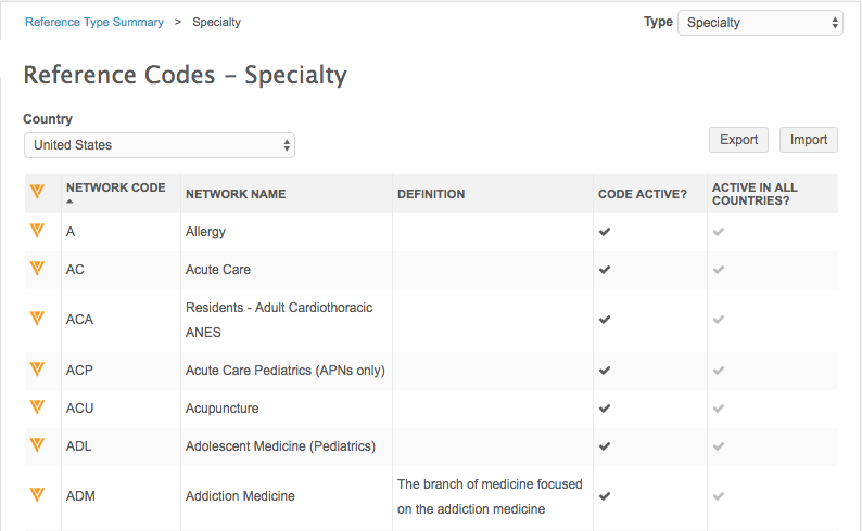 To download reference data your local computer, click Export on the Reference Type Summary page or on individual code page; for example, Specialty. The reference data is exported as a .csv file.