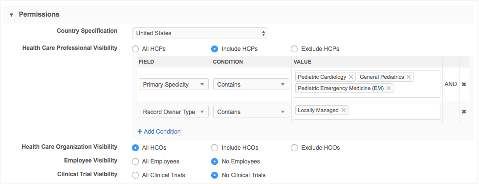 The records will be restricted from search, retrieval, reports, and viewing profiles and apply to the selected entity and any related parent HCOs. This is helpful for restricting records from users when products should be confined to specific HCP prescribers. For example, if you are marketing a drug that could be dangerous for children, you can restrict users from searching or viewing HCP prescribers that specialize in pediatrics. It also helps to provide more relevant search results because users will only see the records that they have access to.