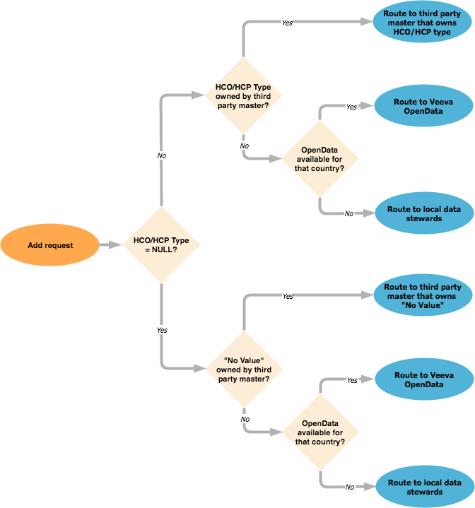 When add requests are submitted for ParentHCO objects, the DCR is routed to the master data stewards only if the child and parent entity have the same owner; otherwise, the DCR is routed to local data stewards for review. Similarly, if the child entity (owned by Veeva OpenData) is changed at the same time that a ParentHCO is added (parent entity is owned by a third party master), the change request and add request are routed to different data stewards. The change request is routed to Veeva OpenData for stewarding and the ParentHCO is routed to local data stewards.