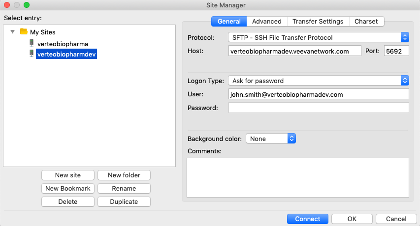 6. Click Connect to save the site and log into the FTP site.