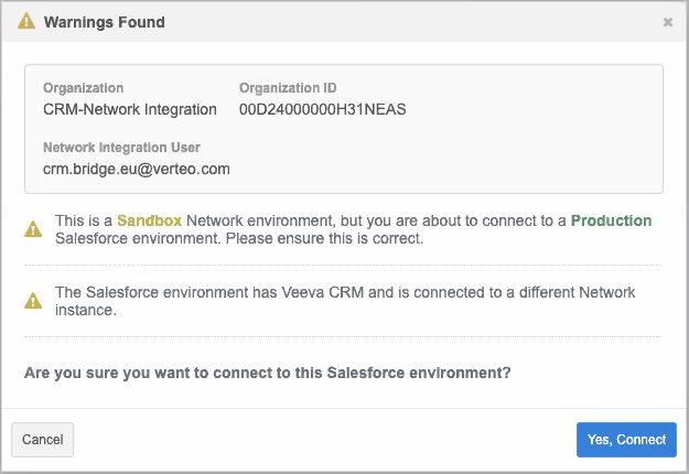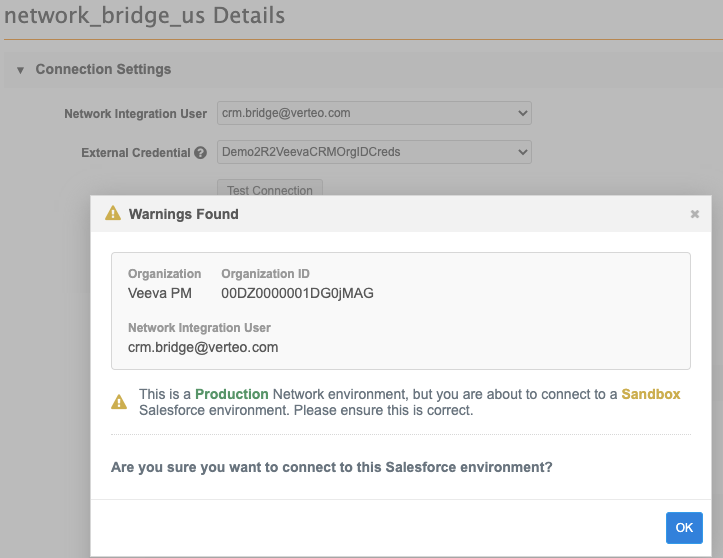 When you click Test Connection for some credential types, Network displays information about the environment that the external credential is linked to. Warnings display if you are potentially connecting to the wrong environment; for example, if the credentials connect your Sandbox Network instance to a Production CRM org.