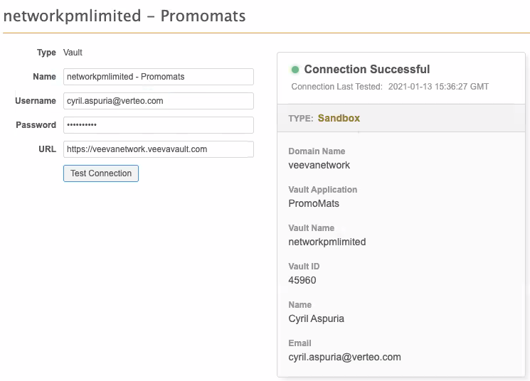 This information also displays in the Network Bridge and Veeva Connector configurations when you click Test Connection.