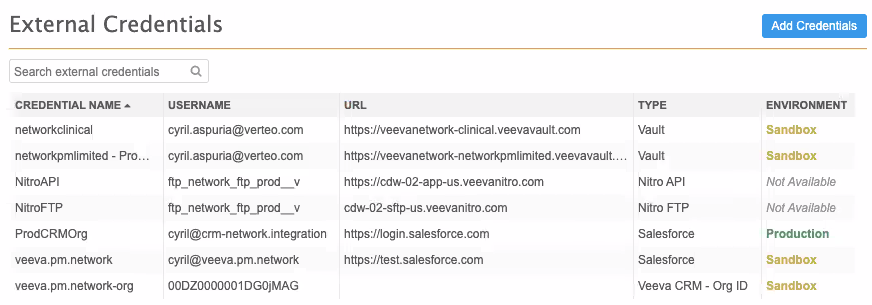 In the list, you can see if the credential is linked to a Production or Sandbox Environment. For some credentials, the Environment column is blank because it does not apply to the credential: for example, Nitro FTP credentials.