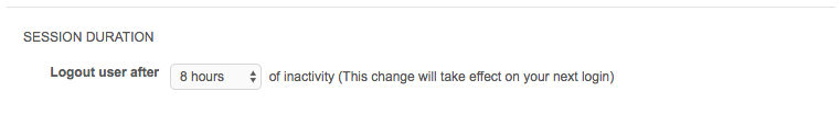 The Session Duration section shows the current timeout setting. Click the Logout user after option and select a duration.