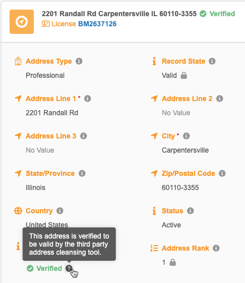 The address verification status displays on the summary card by default if the address has been verified by Network's third party cleansing service. The status does not reflect anything a Data Steward has done or has not done; it is a status from the third party cleansing service only.