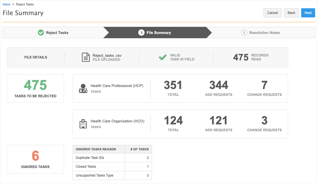 Step 2 (File Summary) contains the details of the file that was uploaded and the records that will be rejected or canceled. A total count of the tasks for each object and counts for each task type display.