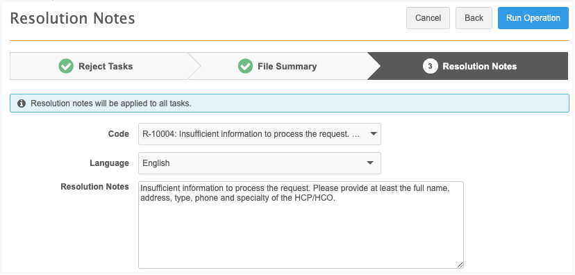 (Reject Tasks only) On Step 3 (Resolution Notes), define the resolution note that will be applied to all of the rejected tasks.
