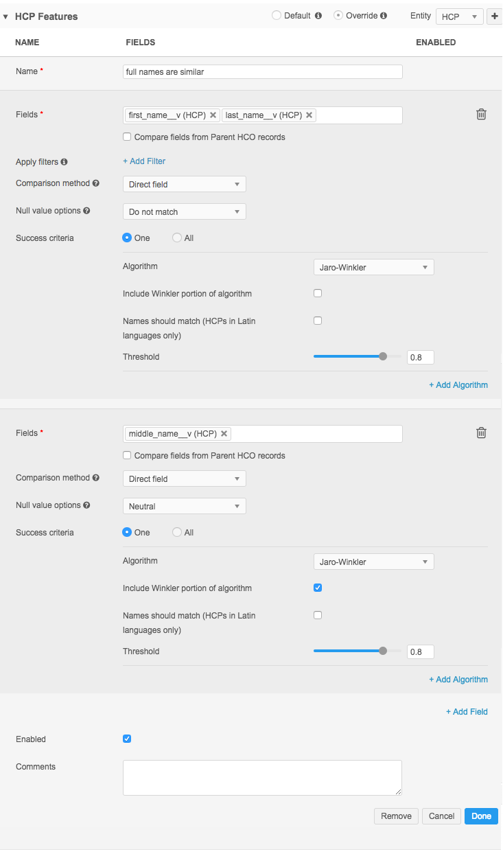 Using null matching set to Neutral (which is the default) allows the rule to compare middle names only if they exist in both records. If this field is blank in either record, the middle name portion of the feature would return a value of ABSTAIN and won’t make the match process fail. This is a good option if there are multiple features in the feature set.