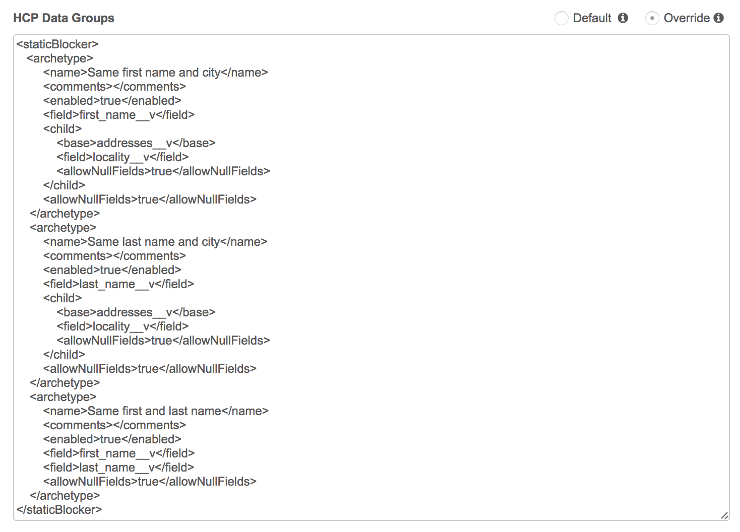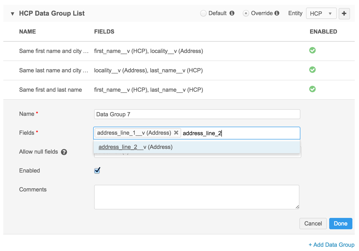 You can only create one data group definition, but it can contain any number of data groups. Each of the HCP and HCO entities must have separate data group definitions. Data group definitions typically contain the following elements: