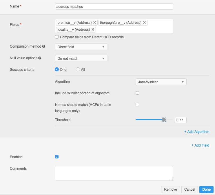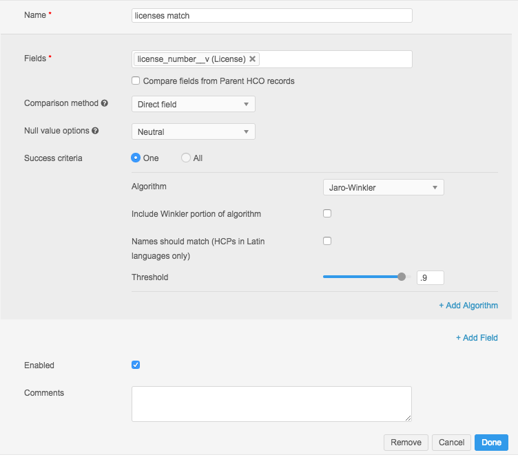 This example is similar to the previous one, but uses a set collation instead of direct, because the collation is being used to compare a sub-object: licenses, addresses, or parent HCOs. It uses Jaro-Winkler, but with a high threshold of 0.9, to eliminate over-matching.