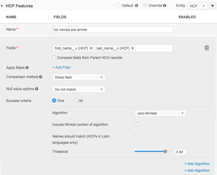 Features determine how individual field pairs are matched and can be uniquely assigned a match algorithm, match filter, confidence level, and null matching treatment. Multiple features make up a feature set.