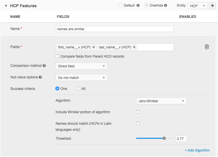 - To the right of the match rules header, click the Entity drop-down list and select HCP or HCO to work with the match rules for that entity type.