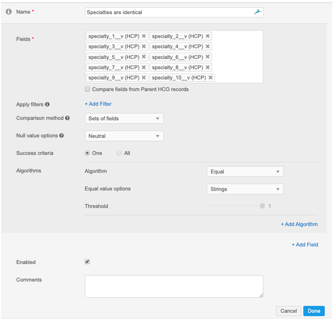 Because specialty fields are reference fields, their values are drawn from a fixed list of values. Equal comparison is used because you want an exact match. Other comparison methods would result in incorrect matching because you don't want similar entries to be considered the same.