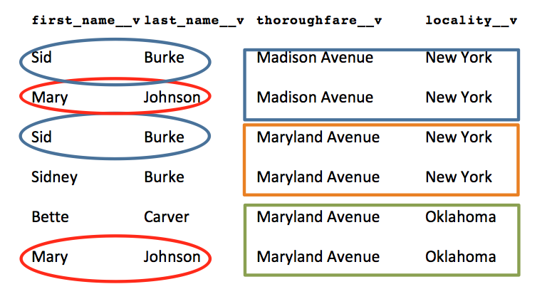 The following example shows how a selection of HCP records would be grouped if the data group definitions included both the Thoroughfare + Locality data group definition and the First Name + Last Name data group definition.