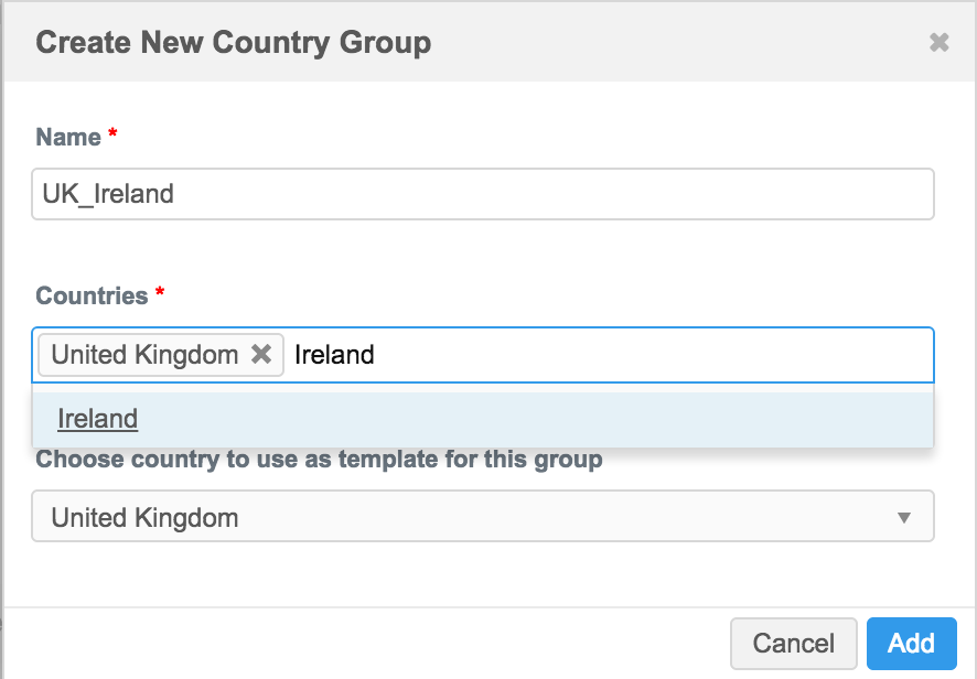 In the Create New Country Group dialog box, type a name for the group, a country or countries to include in the group, and select the country to use as the template for the group. The contents of the template is then used as the starting point for all other countries in that group.