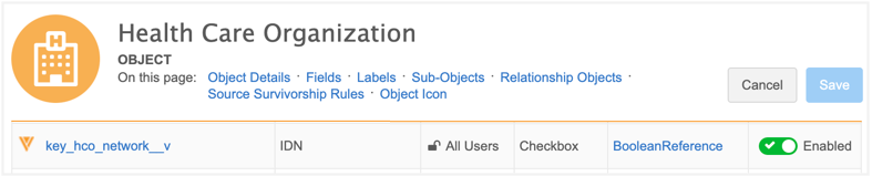 Use the key_hco_network__v field on the HCO object to help you identify the top-level HCOs that are considered key networks (or integrated delivery networks (IDNs)) in your Network instance.