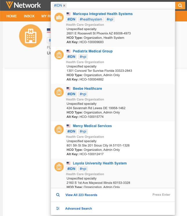 You can find HCOs that are key networks using the #IDN and #keyNetwork hashtags. To search for HCOs and HCPs within a key network's hierarchy, use the key HCO network search feature using the @ symbol and the key network's alias; for example, @MayoClinic. This search displays the HCPs and HCOs in all levels of the Mayo Clinic's hierarchy.