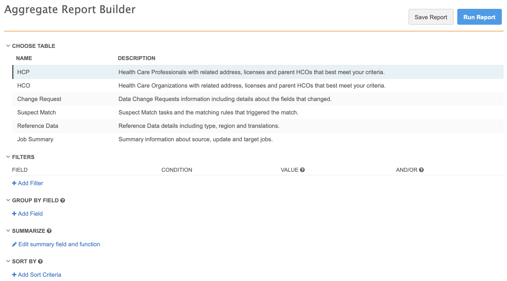 • Change Request - Data change request information, including details about fields that have changed. Only data stewards or users with inbox task groups can access this report type. See the DCR details report for a sample report that uses this type.