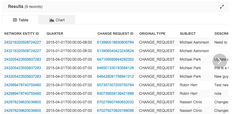 This example finds records where multiple people submitted address DCRs within the same time period. This is a complex query, constructed in multiple stages: