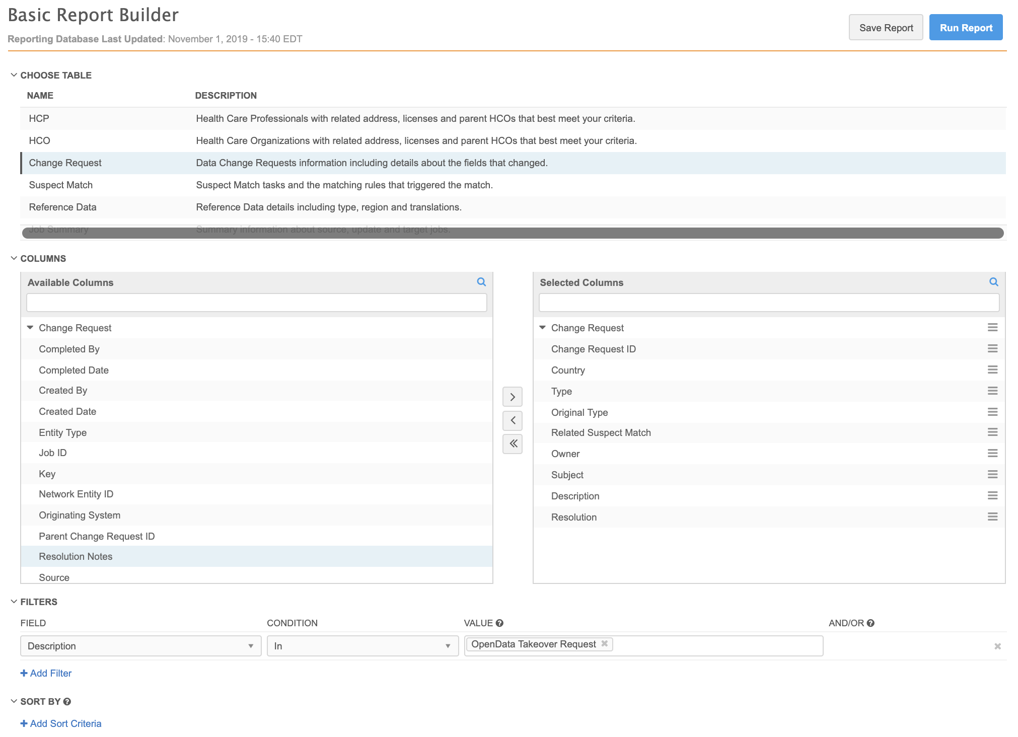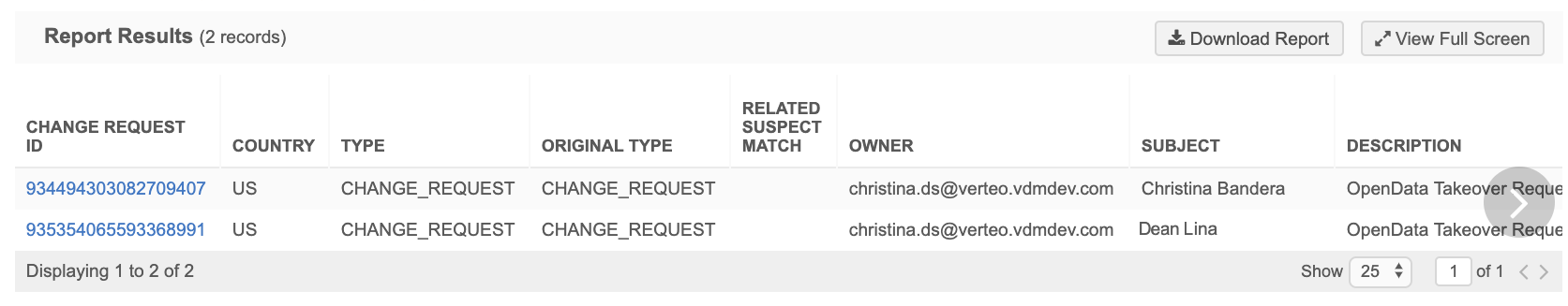 This example retrieves change requests that have been sent to Veeva OpenData using the Send to OpenData feature.