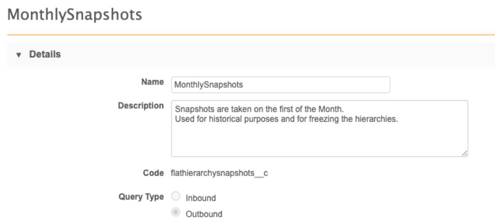 To report on sales roll ups and incentive compensation, you may want to “freeze” the hierarchies over time. To do this, you can take snapshots of hierarchy data using transformation queries. The data is stored in a custom table so you can compare it with data from other time periods.