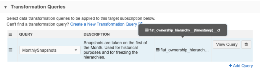 In this section, click Add Query to add the transformation query that you created for the monthly hierarchy snapshot.