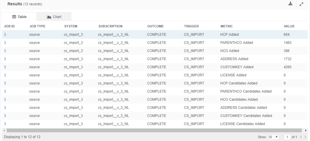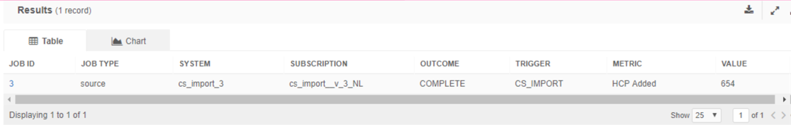 This example finds the Veeva OpenData subscription (cs_import) job that added the most HCPs to your Network instance.