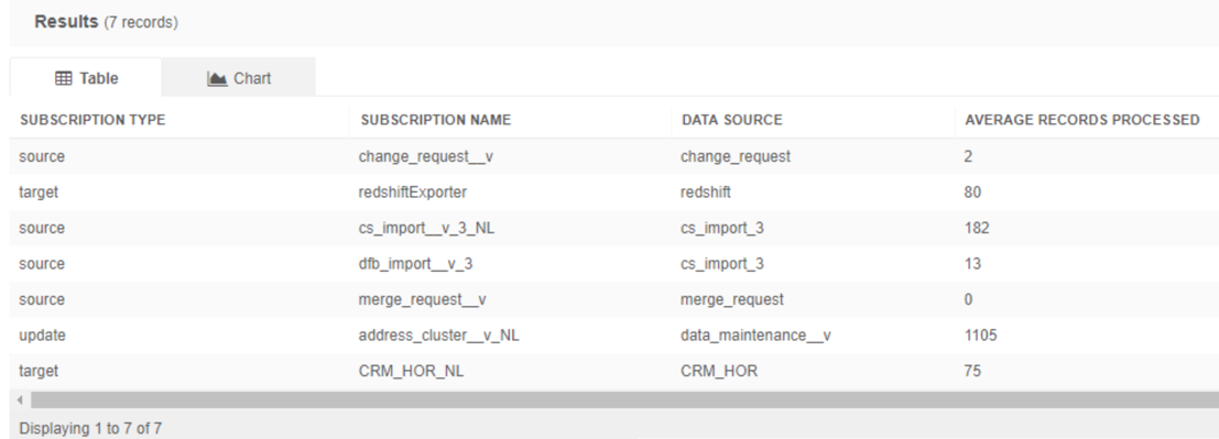 This example reports on the average number of records processed for each job subscription. This example considers completed jobs only.