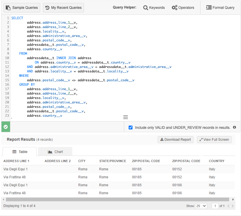 SELECT address.address_line_1__v, address.address_line_2__v, address.locality__v, address.administrative_area__v, address.postal_code__v, addressdata__t.postal_code__v, address.country__v FROM addressdata__t INNER JOIN address ON address.country__v = addressdata__t.country__v AND address.administrative_area__v = addressdata__t.administrative_area__v AND address.locality__v = addressdata__t.locality__v WHERE address.postal_code__v <> addressdata__t.postal_code__v GROUP BY address.address_line_1__v, address.address_line_2__v, address.locality__v, address.administrative_area__v, address.postal_code__v, addressdata__t.postal_code__v, address.country__v